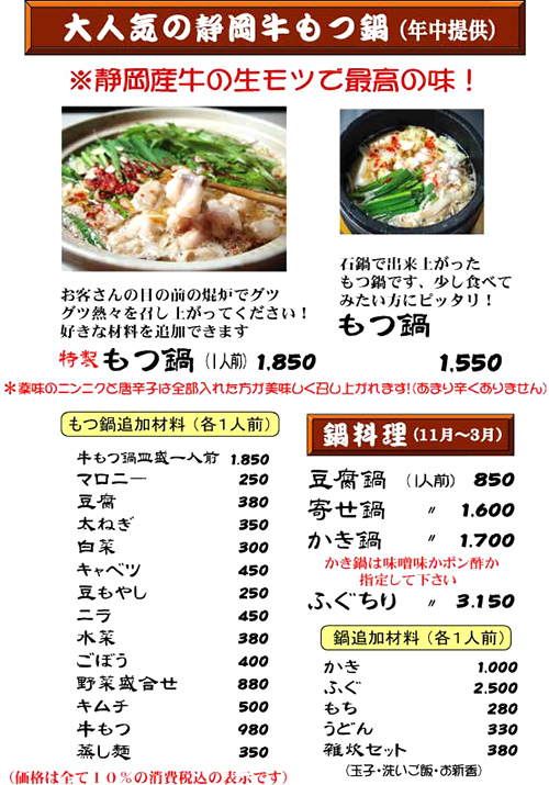 本日入荷 今月のおすすめ おしながき 宴会のご案内 静岡のもつ鍋 ねぎま鍋 お店紹介 イベント